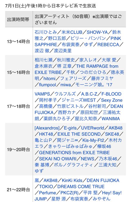Performers schedule for tomorrow's THE MUSIC DAY Negai ga Kanau Natsu