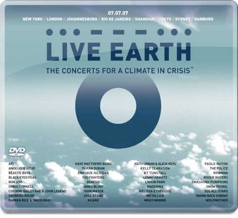 A CD/2DVD package bringing together the most popular artists, best performances, and the solutions-based messaging showcased at this truly global musical event will finally be released by Warner Bros. Records on November 20. The Madonna song picked up for the live album is "Hey You", while the live performance chosen for the DVD is "La Isla Bonita" performed together with Gogol Bordello. Complete Track-listing for "Live Earth - The Concerts for a Climate in Crisis" is as follows: CD: 1. Madonna "Hey You" 2. Foo Fighters "Times Like These" 3. The Police "Driven To Tears" 4. John Mayer "Gravity" 5. Roger Waters "Another Brick In The Wall Part II" 6. Linkin Park "Bleed It Out" 7. Keane "Bedshaped" 8. Bon Jovi "Wanted Dead Or Alive" 9. James Blunt "Wisemen" 10. Chris Cornell "Black Hole Sun" 11. Lenny Kravitz "Are You Gonna Go My Way" 12. Beastie Boys "Intergalactic" 13. KT Tunstall "Suddenly I See" 14. Corinne Bailey Rae & John Legend "Mercy Mercy Me (The Ecology)" 15. Damien Rice & David Gray "Que Sera, Sera" DVD 1: 1. SOS Allstars "Live Earth: London Opening" 2. Genesis "Invisible Touch" 3. Snow Patrol "Shut Your Eyes" 4. Damien Rice & David Gray "Que Sera, Sera" 5. KT Tunstall "Suddenly I See" 6. Taking Back Sunday "My Blue Heaven" 7. Paolo Nutini "What A Wonderful World" 8. Black Eyed Peas "Where Is The Love" 9. Duran Duran "Planet Earth" 10. AFI "Miss Murder" 11. John Mayer "Gravity" 12. Corinne Bailey Rae & John Legend "Mercy Mercy Me (The Ecology)" 13. Keane "Bedshaped" 14. Metallica "Sad But True" 15. Melissa Etheridge "I Need To Wake Up" 16. Dave Matthews Band "Too Much" 17. Kelly Clarkson "Sober" 18. Angelique Kidjo "Tumba" 19. Joss Stone "Right To Be Wrong" 20. James Blunt "Wisemen" 21. Beastie Boys "Intergalactic" DVD 2: 22. Keith Urban & Alicia Keys "Gimme Shelter" 23. Enrique Iglesias "Bailamos" 24. Missy Higgins "Steer" 25. Wolfmother "Woman" 26. Chris Cornell "Black Hole Sun" 27. Bon Jovi "Wanted Dead Or Alive" 28. Lenny Kravitz "Are You Gonna Go My Way" 29. Smashing Pumpkins "United States" 30. Roger Waters "Another Brick In The Wall Part II" 31. The Police "Driven To Tears" 32. Crowded House "Better Be Home Soon" 33. Rihanna "Umbrella" 34. Linkin Park "Bleed It Out" 35. Foo Fighters "Times Like These" 36. Madonna feat. Gogol Bordello "La Isla Bonita" The track-listing for "Live Earth - The Concerts for a Climate in Crisis" Digital Album is as follows: 1. Madonna "Hey You" 2. Foo Fighters "Times Like These" 3. The Police "Driven To Tears" 4. John Mayer "Gravity" 5. Roger Waters "Another Brick In The Wall Part II" 6. Linkin Park "Bleed It Out" 7. Keane "Bedshaped" 8. Bon Jovi "Wanted Dead Or Alive" 9. James Blunt "Wisemen" 10. Chris Cornell "Black Hole Sun" 11. Lenny Kravitz "Are You Gonna Go My Way" 12. Beastie Boys "Intergalactic" 13. KT Tunstall "Suddenly I See" 14. Corinne Bailey Rae & John Legend "Mercy Mercy Me (The Ecology)" 15. Damien Rice & David Gray "Que Sera, Sera" 16. John Mayer "Waiting On The World To Change" (iTunes Pre-Order Only track) |