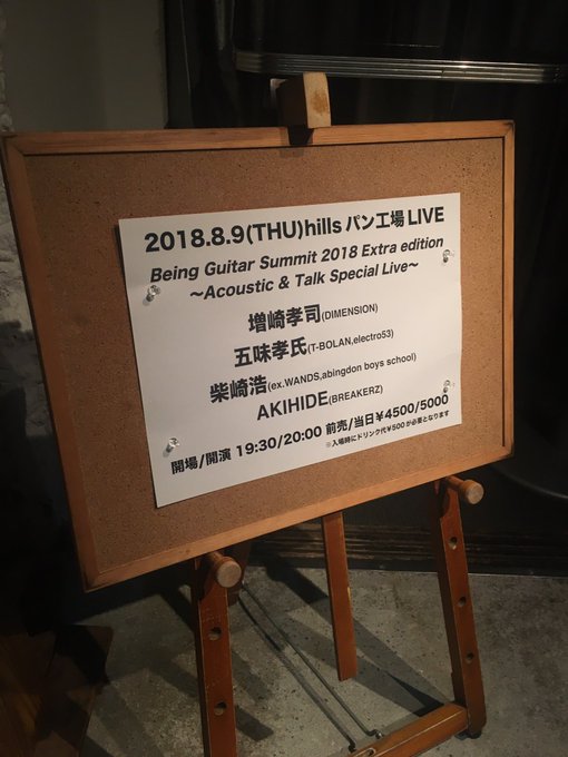 ● 10th Aug 2018 (Today) Billboard LIVE osaka Doors Open / Concert starts : 5.30pm / 6.30pm (1st session) , 8.30pm / 9.30pm (2nd session) {all timings are in Japan time} Musicians :: Guitarist ~ Masuzaki Takashi (DIMENSION) × Gomi Takashi (T-BOLAN , electro53) × Shibasaki Hiroshi (ex.WANDS , abingdon boys school) × AKIHIDE (BREAKERZ) Bassist ~ Tokunaga Akihito (doa) Drummer ~ Bandoh Satoshi (T-SQUARE) Special guest - Ohga Yoshinobu (Sensation) Taken at Billboard LIVE osaka https://pbs.twimg.com/media/DkPLx43U...jpg&name=small https://pbs.twimg.com/media/DkPLyrnV...jpg&name=small https://twitter.com/acu200504/status...89221497839616 My friend had something on so she's unable to attend Being Guitar Summit 2018 Vol.06 today :x At least my friend went for Being Guitar Summit 2018 Extra edition ~Acoustic & Talk Special Live~ last night . She said AKIHIDE looked great and that his blonde hairdo has grown on her x) |
