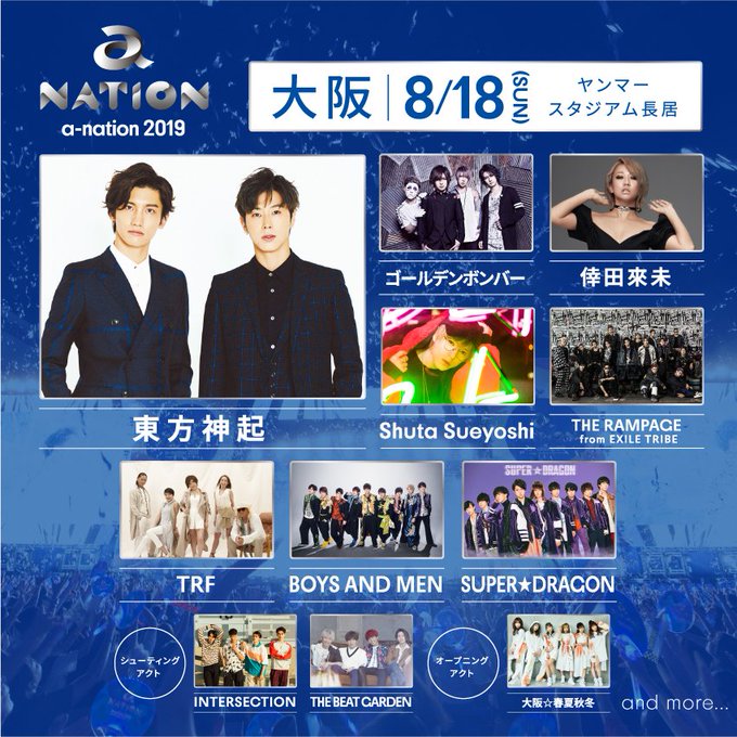https://pbs.twimg.com/media/D87pW4zUYAEOIbQ.jpg:small ≪大阪公演2日目≫ 日時:2019年 8月18日(日) 開場13:00 / 開演15:00 ※開場/開演時間は変更になる場合がございます。 会場:ヤンマースタジアム長居 出演アーティスト:ヘッドライナー 東方神起 ゴールデンボンバー / 倖田來未 / Shuta Sueyoshi / THE RAMPAGE from EXILE TRIBE / TRF / BOYS AND MEN / SUPER★DRAGON シューティングアクト:INTERSECTION / THE BEAT GARDEN オープニングアクト:大阪☆春夏秋冬 a-nation 2019 on 18th Aug will take place at Osaka's Yanmar Stadium Nagai https://rhythmzone.net/koda/news/detail.php?id=1073795 https://twitter.com/anation_navi/sta...85625549758464 |