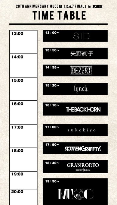 Performers schedule for next Wed's 20TH ANNIVERSARY MUCC Sai「えん7 FINAL」in Nippon Budokan