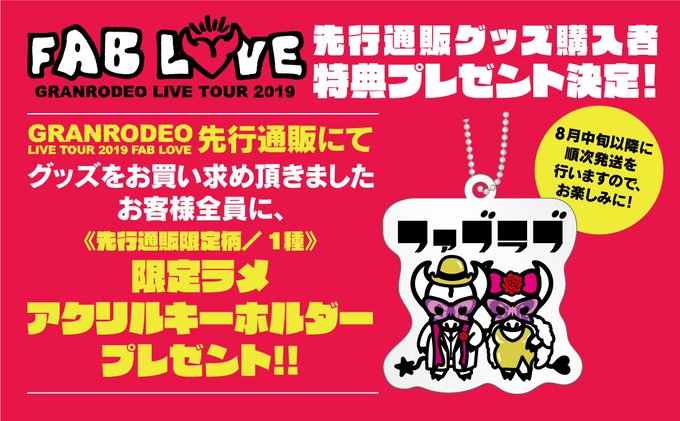 - Fan - Gina recycle bag - Tattoo sticker - Venue limited fastener brand (23rd Aug version design) https://twitter.com/GR_staff/status/1164803157903282177 https://twitter.com/GR_staff/status/1164809676355039235 https://twitter.com/GR_staff/status/1164814647616106496 Today & tomorrow's GRANRODEO LIVE TOUR 2019 "FAB LOVE" concerts at Tokyo's Zepp DiverCity are both sold out |