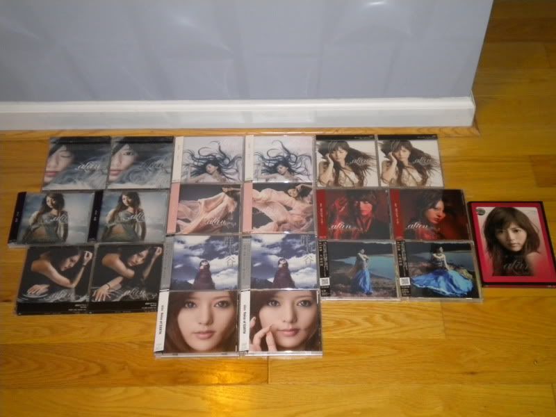 wow! that is a really nice collection ^^ I only buy CD+DVD versions :D I'm not that rich to get all the CD only as well lol I have to buy ayu's singles, dvds, and all that too :( |