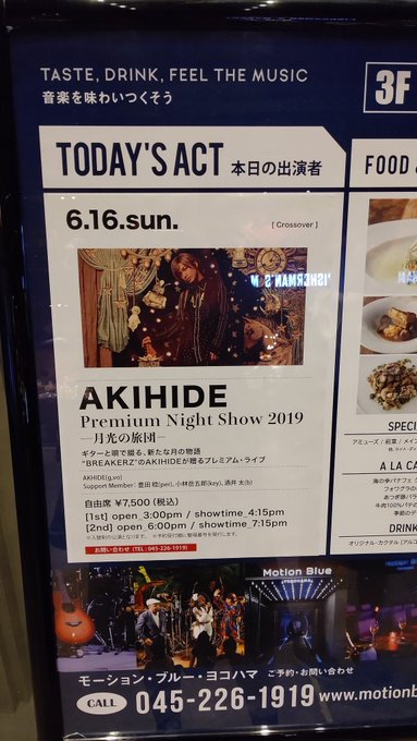 For today's performance schedule 1st session - Doors open : 15:30 / Concert starts : 16:45 2nd session - Doors open : 18:30 / Concert starts : 19:45 http://akihide.com/special/gekko_ryodan/ http://www.motionblue.co.jp/artists/akihide/ |