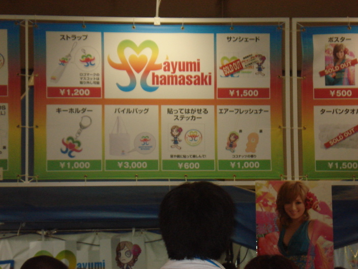 I gotta say that is order list is correct!! Koda kumi was the concert opener and she was really good and it shocked everyone in the concert! I think they kinda change the order for each town..depending which artists show up since there was no boa or otsuka ai in the nagoya concert..Ayu goods was soooo popular in the concert..when the concert ended almost all her goods were sold out..thank god i got mine before it started..i gotta say the most popular item was the ayu fan..almost everyone had one..and then the a-nation fan..also most people had the ayu towel..the smaller one..i took only two pics in the concert which was in the goods areas which shows that most of her goods were sold out lol..not many people bought koda kumi stuff(they didnt look that nice..however lots of people bought 4 hot wave =)!!!) but i saw some kumi towels..i will upload the pics after i come back from japan in 3 weeks..ok let me cut to the details of ayus part of the concert!! I will also show pics of the goods i got hehehe..oh ya btw the set list is wrong..I sat somewhere near the back of the middle section so i just saw the bodies fine but not the face hehee..which is good since i got my ticket from family mart hahaha..