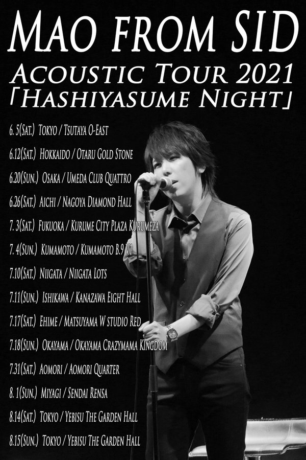 Aki - AKi Tour 2020 『Collapsed Land』 https://twitter.com/sid_staff/status...82998532526081 Mao - Acoustic Tour 2020 「Hashiyasume Night」 Both solo tours originally supposed to take place last year https://twitter.com/sid_staff/status...82997790007299 Also next month's SID LIVE 2020 -Star Forest- has been given the go ahead to continue even though I still think it's a bad idea for everything to proceed on :s