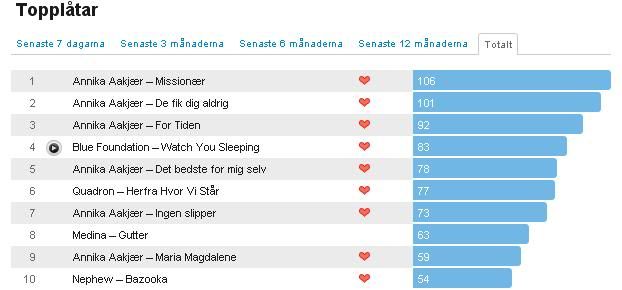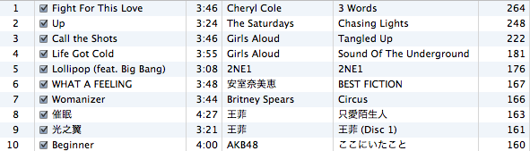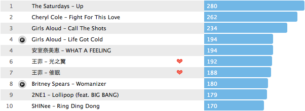 01 倖田來未 – 好きで、好きで、好きで。 (147) 02 倖田來未 – POP DIVA (137) 03 倖田來未 – Hey baby! (124) 04 KAT-TUN – RESCUE (97) 05 Lady Gaga - Judas (73) 06 倖田來未 – Black Candy (72) 07 倖田來未 – TABOO (59) 08 이효리 – AnyClub (56) 09 Mariah Carey - The Roof (55) 10 2NE1 - Fire (55) Say what you want, this is my chart from last.fm.