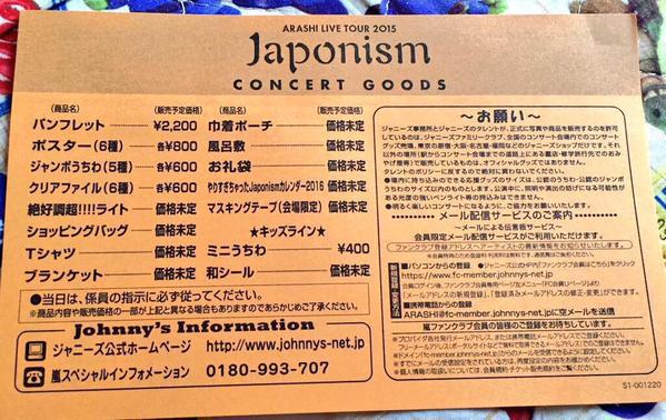 ![]() https://twitter.com/tlclip/status/655598283465715714 Goods with confirmed prices Pamphlet - ¥2,200 Poster (5 solos , 1 group) - ¥600 each Jumbo Uchiwa (5 solos) - ¥600 each Clearfile (5 solos , 1 group) - ¥600 each Mini Uchiwa (5 solos) - ¥400 Goods with unconfirmed prices Zekkouchou-chou Lightstick Shopping bag T-shirt Blanket Drawstring pouch Wrapping cloth Gratitude envelope Over the top Japonism 2016 calendar Masking tape (concert venue exclusive item) Stickers Too bad this time round there's no USB thumbdrive unlike last year's ARASHI LIVE TOUR 2014 THE DIGITALIAN which at that time I asked my mum's colleague's daughter to help me buy as she attended it Oh well , hopefully ARASHI LIVE TOUR 2015 Japonism goods will be nice unlike ARASHI LIVE TOUR 2013 "LOVE" goods which were horribly cheaply produced :x