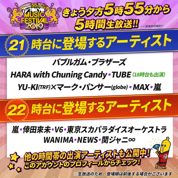Fuji TV will broadcast FNS Uta no Natsu Matsuri live on 24th July & it will last about 4 1/2 hours <出演者> IZ*ONE / 嵐 / Kis-My-Ft2 / KinKi Kids / 倉木麻衣 / 昆夏美 / 柴咲コウ / ジャニーズWEST / SixTONES / 宝塚歌劇団 雪組 / DA PUMP / 中村倫也&木下晴香 / 新妻聖子 / 乃木坂46 / 日向坂46 / ブラスト!:ミュージック・オブ・ディズニー 2019 / Hey! Say! JUMP / ミッキーマウスとディズニーの仲間たち / 山崎育三郎 / Little Glee Monster / WANIMA / and more 司会:森高千里 / 渡部建 / 加藤綾子 https://natalie.mu/music/news/336973 https://twitter.com/fns_kayousai/sta...47420467245056 To celebrate ARASHI's 20th anniversary , they will be doing a 2 songs medley of A・RA・SHI + Hatenai Sora on FNS Uta no Natsu Matsuri https://twitter.com/fns_kayousai/sta...47672469442560 On that note , today is Flying Get day for 5x20 All the BEST!! 1999-2019 !