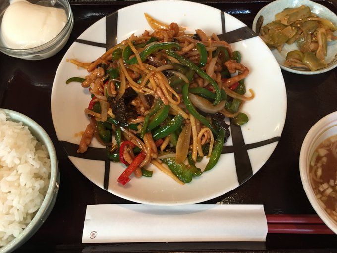 SHINPEI had Chinese food , yum . Looks like a nice stir fried veggie dish with noodles (which still came with a standalone bowl of rice ? o_O )