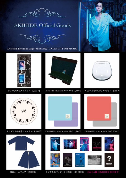 http://akihide.com/special/under_city_pop_music/#goods https://musing.jp/shop/akihide_goods/ Considering AKIHIDE「Angya Anata no Machi e...」season 2 will begin next Sat at Saitama's Nishikawaguchi Hearts , it's a bit surprising Being chose to release AKIHIDE Premium Night Show 2022 -UNDER CITY POP MUSIC-concert goods list today That said , the various images used for the random can badge(s) are really nice & the joint Namida-kun tumblr + coaster are quite cute and once again Namida-kun takes centre stage on this x) I'll be surprised if no new goods will be released for AKIHIDE「Angya Anata no Machi e...」season 2 but we'll see