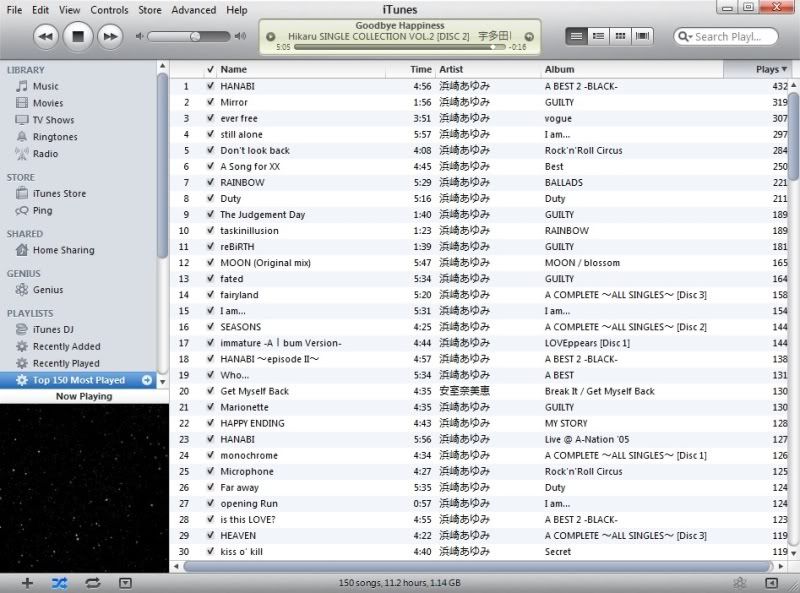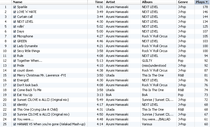 here's mine...not very much variety here!!! this would probably be different but i had to restart all my play counts a couple of years ago. overall, i would guess my top played song ever would be pride by ayumi followed by rainbow, but this is what i have officially.