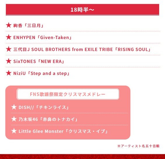 ![]() ![]() ![]() 1. Silent Night 2. Negai Boshi 3. Heart Up 4. Yuki no Hana (Mika Nakashima) 5. Shiroi Koibitotachi (Kuwata Keisuke) 6. Dizzy 7. THIS IS THE TIME 8. DEPARTURES (globe) 9. Miagete Goran Yoru no Hoshi wo (Sakamoto Kyu) 10. Ai Kotoba 11. I believe 12. CAN YOU CELEBRATE? (Namie Amuro) 13. Christmas song medley We Wish You A Merry Christmas White Christmas Red-nosed reindeer 14.Xmas Santa https://www.barks.jp/news/?id=1000194371