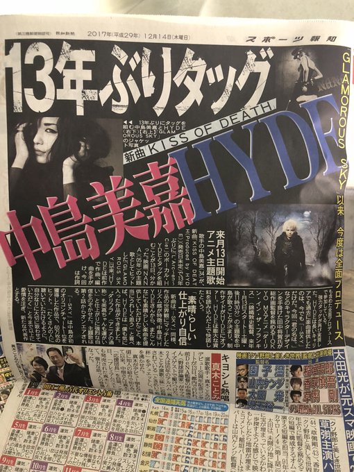 ![]() https://twitter.com/KAZCiel/status/941078523929796610 I don't mind if KISS OF DEATH sounds like Hitoiro which I feel it's quite under-rated And I know I previously wrongly wrote KISS OF LIFE . That's because I was watching Hirai Ken's performance of KISS OF LIFE at last week's 2017 FNS Kayousai when I saw news updates on Mika working with hyde again I get mixed up with song titles from time to time , it's no big deal . It's not as though I committed such a huge sin and crime in something like this
