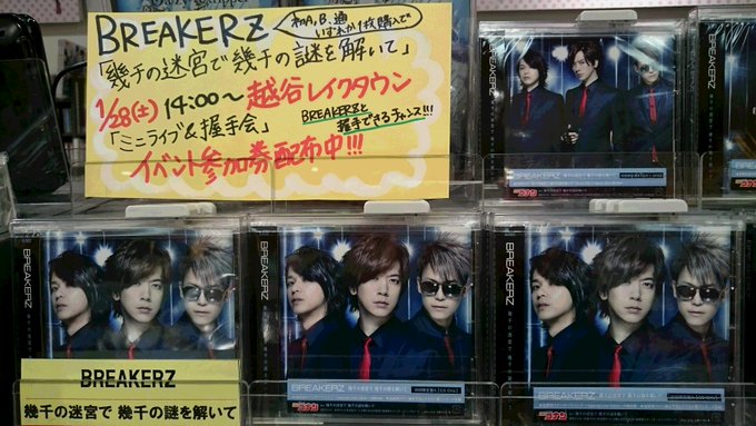 For today Venue : Saitama's Ion Laketown kaze 1F Hikari no Hiroba Time : 2pm fans have to purchase Ikusen no Meikyuu de Ikusen no Nazo wo Toite at the respective CD stores listed on the website in order to join/qualify to attend today's last handshake & mini live event http://breakerz-web.net/info_re_062.html http://laketownkaze-aeonmall.com/news/event/1400 I forgot to say that for last Wed's mini live & handshake event , Tower Records Shibuya was the only CD shop in Tokyo that you're only able to get the handshake event ticket/s to o_O But of course at Tokyo's Odaiba Venus Fort 2F Kyoukai Hiroba itself , you could buy Ikusen no Meikyuu de Ikusen no Nazo wo Toite before the event began Ah I'm still dreaming about last Sun's , xD