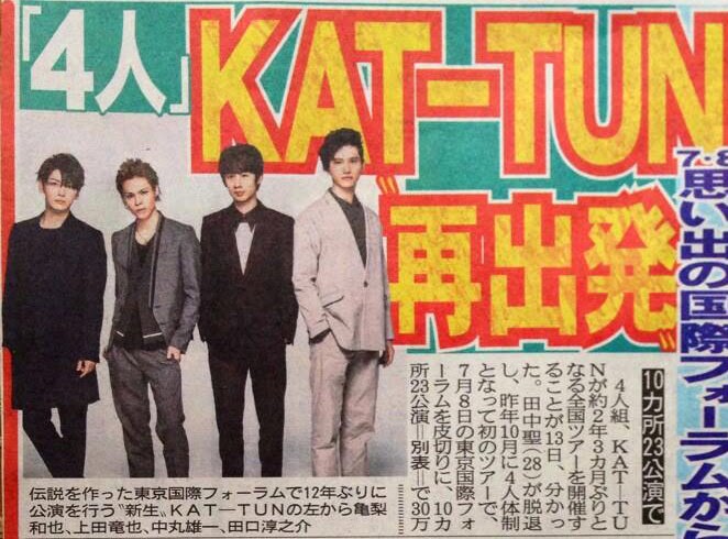 The group held their first solo concert at Tokyo International Forum in 2002 after the formation of the group, but they will now perform as a group of 4 for the first time after 12 years. Kazuya Kamenashi(亀梨和也) (28) said, "The New KAT-TUN is going to have new approach on things. I look forward to what we will make of it". Tatsuya Ueda(上田竜也) (30) proudly commented, "It's going to be great."