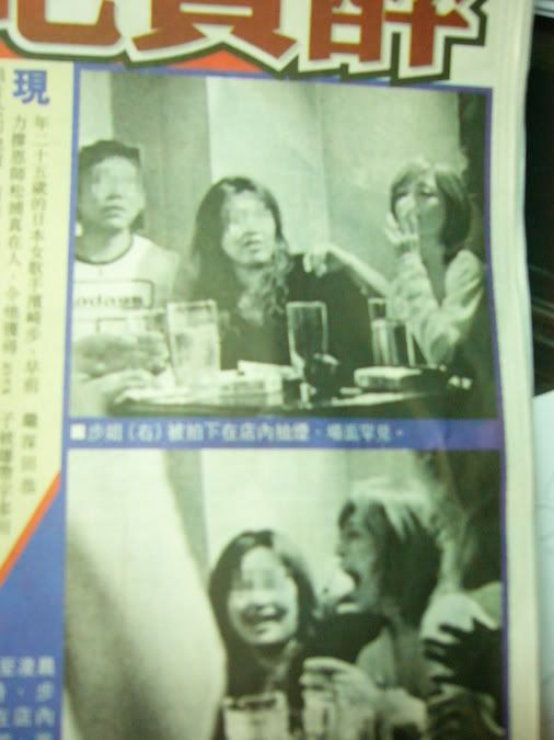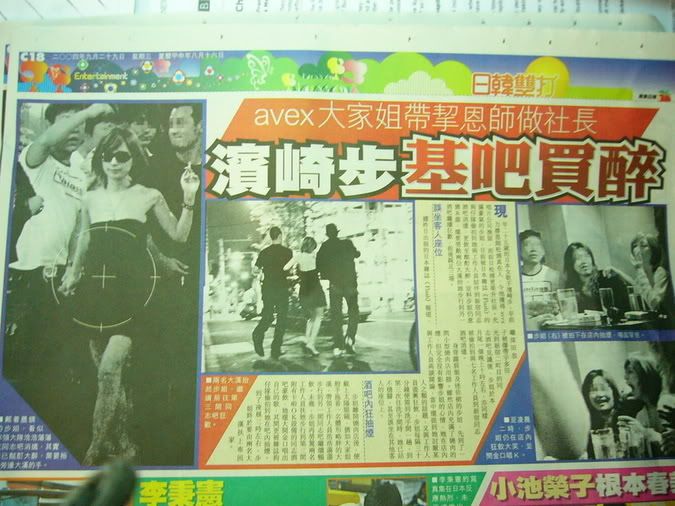 This is from apple daily of Hong Kong. ![]() 現 年 二 十 五 歲 的 日 本 女 歌 手 濱 崎 步 , 早 前 力 撐 恩 師 松 浦 真 在 人 , 令 他 獲 得 avex 唱 片 公 司 挽 留 , 而 前 日 松 浦 更 榮 升 社 長 。 充 滿 豪 氣 的 步 姐 , 日 前 被 日 本 雜 誌 《 Flash 》 的 狗 仔 隊 偷 拍 到 她 與 工 作 人 員 結 伴 到 新 宿 同 志 酒 吧 消 遣 , 更 飲 至 酩 酊 大 醉 。 豈 料 步 姐 仍 意 猶 未 盡 , 還 要 勞 動 兩 位 大 漢 抬 她 步 行 到 另 一 酒 吧 繼 續 狂 歡 , 前 後 踩 足 三 場 。 ![]() 誤 坐 客 人 座 位 據 昨 日 出 版 的 日 本 雜 誌 《 Flash 》 報 道 , 繼 深 田 恭 子 被 爆 帶 宇 多 田 光 到 新 宿 二 町 目 的 同 志 酒 吧 見 識 後 , 步 姐 於 本 月 尾 一 個 晚 上 十 時 左 右 , 亦 同 樣 被 偷 拍 到 與 七 名 工 作 人 員 到 新 宿 同 志 酒 吧 消 遣 。 身 穿 露 肩 裝 及 迷 你 裙 的 步 姐 , 先 到 了 一 間 小 型 燒 肉 店 用 膳 。 雖 然 店 內 充 滿 了 燒 肉 的 煙 , 但 完 全 沒 有 影 響 步 姐 的 心 情 , 她 在 店 內 與 工 作 人 員 高 談 闊 論 , 當 中 還 提 到 她 討 厭 某 人 之 類 的 話 題 , 又 與 工 作 人 員 盡 興 狂 飲 , 步 姐 每 隔 三 十 分 鐘 便 需 到 洗 手 間 一 趟 , 到 第 三 次 往 洗 手 間 時 , 她 已 站 不 穩 腳 , 甚 至 誤 坐 在 其 他 客 人 的 座 位 上 。 ![]() 酒 吧 內 狂 抽 煙 步 姐 離 開 燒 肉 店 後 , 便 戴 上 太 陽 眼 鏡 , 猶 如 大 家 姐 般 手 拖 一 名 體 形 略 胖 的 大 漢 , 帶 領 工 作 人 員 浩 浩 蕩 蕩 步 行 到 另 一 間 同 志 吧 繼 續 暢 飲 。 未 幾 , 步 姐 再 勞 駕 兩 名 工 作 人 員 扶 她 步 行 到 第 三 間 附 有 卡 啦 O K 設 備 的 同 志 酒 吧 豪 飲 , 她 還 大 開 金 口 唱 出 自 己 的 歌 , 其 間 更 被 雜 誌 狗 仔 隊 偷 拍 到 她 在 吧 內 抽 煙 。 到 了 凌 晨 三 時 左 右 , 步 姐 終 於 要 由 兩 名 大 漢 扶 上 車 回 家 。 Partial English translation : The present age 25 year-old Japan female singer Ayumi Hamasaki , early supported the her teacher Aya Maxturra, makes him to obtain the avex record company to detain, but the day before yesterday loose water's edge glory rose the organization head. Fills the heroic spirit step of elder sister, on the other day by Japanese magazine "Flash" photographers surreptitiously to her accompanies with the staff newly sleeps comrade the bar to while away the time, drinks to is dead drunk. Who would imagine a step of elder sister still haven't givened full expression, but also had to work two guys to lift her to walk to another bar continuation revelry, around stepped on foot three.