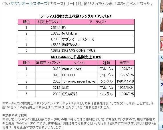 I was refering to the issue of oricon with Mr.Children's album on 2005 so they posted that ayu has sold over 46 million copies and the 4th best selling japanese artist after B'z, Mr. Children and Southren All Stars which are all boy bands. |