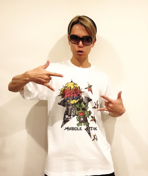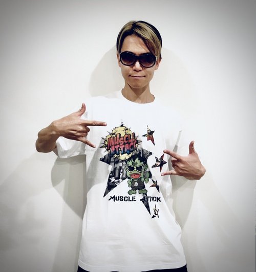 SHINPEI promoting/wearing the MUSCLE ATTACK 10th ANNIVERSARY LIVE T-shirt