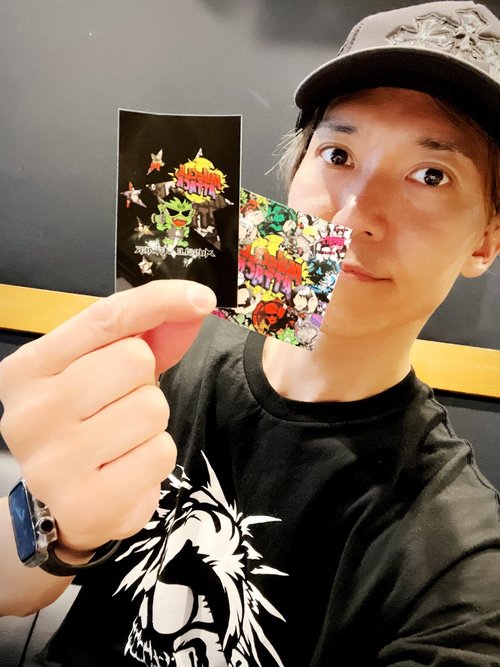 SHINPEI promoting/wearing the MUSCLE ATTACK 10th ANNIVERSARY LIVE T-shirt & sticker(s)