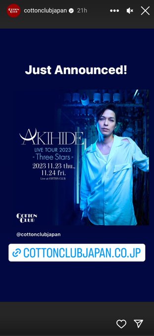 https://i.ibb.co/n0BLb18/AKIHIDE-LIV...hree-Stars.jpg AKIHIDE LIVE TOUR 2023 -Three Stars- formed as part of the 10th anniversary Three Stars Map of AKIHIDE's Unlike previous solo tours AKIHIDE did , AKIHIDE LIVE TOUR 2023 -Three Stars- will have 2 different styles , Solo Style & Band Style And for each of the 6 dates , AKIHIDE will perform 2x Solo Style dates : 11/4 (Sat) Hokkaido @ Sapporo Coo 11/5 (Sun) Fukuoka @ Fukuoka ROOMS Only AKIHIDE himself will perform by his own for both dates Band Style dates : 11/10 (Fri) Aichi @ Nagoya BL café 11/12 (Sun) Osaka @ BERONICA 11/23 (Thu) Tokyo @ COTTON CLUB 11/24 (Fri) Tokyo @ COTTON CLUB 23rd Nov is a public holiday in Japan ie. Labour Thanksgiving Day Backup musicians for AKIHIDE LIVE TOUR 2023 -Three Stars- : Bass :Sunayama "Sunapanng" Junichi Drums :KAZU Keyboards :Yamazaki Takeru https://twitter.com/AKIHIDE_RAINMAN/...77999075033088 https://i.ibb.co/ZxWYx6w/AKIHIDE-LIV...ars-Banner.jpg Stoked & it's interesting 2 different styles will be utilised for AKIHIDE LIVE TOUR 2023 -Three Stars- The only 2 dates that have the Solo Style aspect reminds me very much of what AKIHIDE did for AKIHIDE “SOLO” LIVE 2019 NAKED MOON2 -Hoshioi no Shoujo- , AKIHIDE LIVE TOUR 2021 -BLACK UNICORN- & AKIHIDE「Angya Anata no Machi e...」seasons 1 - 3 In addition , this will be the 1st time AKIHIDE will perform at Osaka's BERONICA & Sapporo Coo This will be the 1st time KAZU will be backing AKIHIDE up solo wise & KAZU wrote on Twitter that this will be his 1st time supporting a solo artiste during a tour : https://twitter.com/KAZU_drs/status/1676756442446168064 https://twitter.com/KAZU_drs/status/1676740209990352897 |