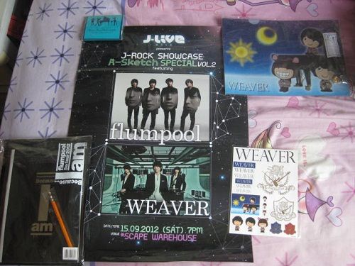 Prior to last night's amazing super duper kick ass concert , I bought the following concert goods from them :D flumpool : https://twitpic.com/show/large/av5cfv flumpool 5th tour 2012 「Because... I am」stationery set (notebook , mechanical pencil & slider case) WEAVER : https://twitpic.com/show/large/av5auh WEAVER 3rd TOUR 2011 sun & moon stationery set (Clearfile + brass mechanical pencil) https://twitpic.com/show/large/av5b6v left - WEAVER 3rd TOUR 2011 sticker sheet 2011 right - WEAVER Live House TOUR 2012 「Piano Trio Philosophy ~do YOU ride on No.66?~」 button set of 3 Frankly all the concert goods being sold last night were very costly :dead2 but it's not often 2 amazing / talented / wonderful JRock bands come to S'pore to perform so :p The free poster I obtained as I paid for VIP tickets last night 8D http://img.photobucket.com/albums/v2...g/IMG_5172.jpg Truly an amazing concert . 3 1/2 hours worth of non stop kick ass rocking entertainment (while in the process of almost losing my voice lmao) but I survived & live to tell the tale :D |