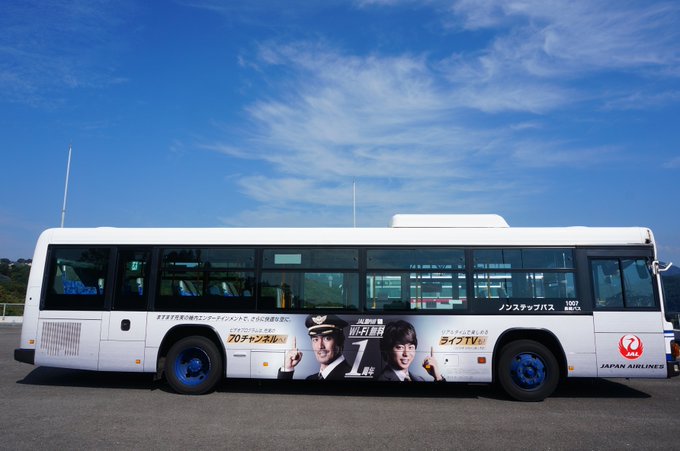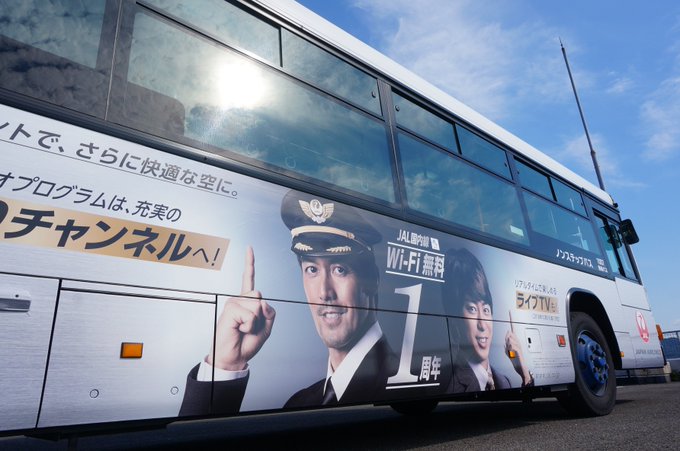 Abe Hiroshi & Sakurai's faces plastered on a bus promoting the 1st anniversary of free wifi that JAL offers domestically in Japan