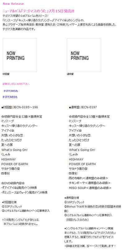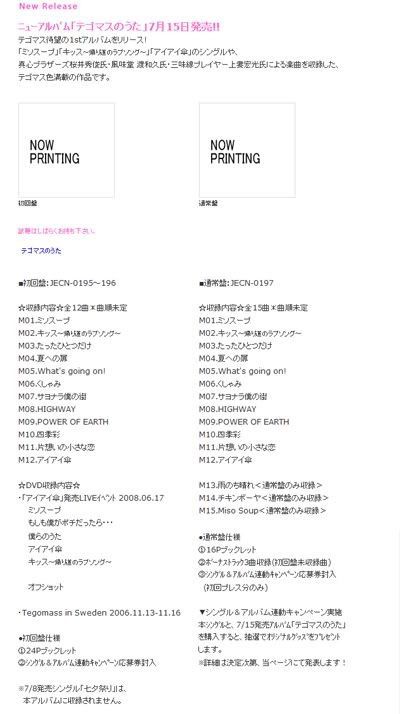 seems that the original tracklist has been now changed & being shuffled around unlike the one that I saw on CDJapan's site old update via Johnny's Entertainment site : http://i232.photobucket.com/albums/e...-tegomasu2.jpg new update : http://i232.photobucket.com/albums/e...e-tegomasu.jpg CD + DVD tracklist : M01 Miso Soup M02 Kiss~Kaeri michi no Love Song M03 Tatta Hitotsu Dake M04 Natsu e no tobira M05 What's going on! M06 Kushami M07 Sayonara boku no machi M08 HIGHWAY M09 POWER OF EARTH M10 Shikisai M11 Kataomoi no chiisana koi M12 AiAi Gasa DVD contents - AiAi Gasa Live event 2008.06.17 Miso Soup Moshimo Boku ga Pochi dattara・・・ Bokura no uta AiAi Gasa Kiss~Kaeri michi no Love Song~ - Offshot [Tegomass in Sweden 2006.11.13-11.16] And for the regular version includes 15 songs ( in M01 - M12 are similar with the Limited) M13 Ame nochi hare M14 Chicken Boya (*Chicken boy) M15 MISO SOUP thanks to http://kparadisek.livejournal.com/ for the help in a way I'm glad that now the 1st 3 tracks are not singles that they have already released as that was the old arrangement . It's better to spread everything out I guess I can download the DVD contents from the net . I suspect MISO SOUP might be the Eng version but we'll see on that |
