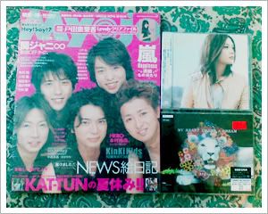 i got these over the weekend. L'Arc~en~Ciel - MY HEART DRAWS A DREAM (Single) Myojo - October 2007 (Arashi) (Magazine) YUI - CAN'T BUY MY LOVE (CD-only) (Album) |