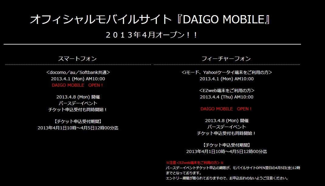 DAIGO MOBILE website to launch tomorrow (April 1st) at 10am / Japan time + release of URL link