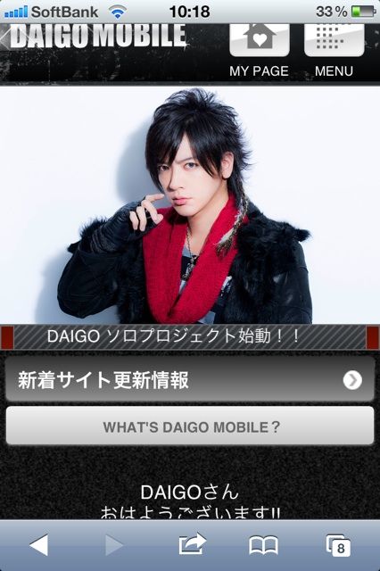 明日10時オープン!DAIGO MOBILE、URLのお知らせ DAIGOをより身近に、今まで知らなかったDAIGOが見れる!? 「DAIGO MOBILE」では、オリジナル待受、着ボイス、DAIGOのライブやイベントなどのチケット先行予約を行 なっていきます!! And here's the URL link for DAIGO MOBILE : http://daigo.mobi/ Here's how the frontpage of DAIGO MOBILE looks like (for the time being) : http://img.photobucket.com/albums/v2...0II/310313.jpg http://breakerz-web.net/info_ot_024.html#daigomobile It's only via DAIGO MOBILE that tickets for both his 35th birthday & 1 night only DAIGO☆STARDUST concerts can be purchased . Musing & team brz will not release any preorder links for both events , unlike what happened for AKIHIDE's tour . |