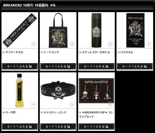 Leftover BREAKERZ 10 Shunen 10ban Shoubu -VS- concert goods can be ordered via Musing now http://img.photobucket.com/albums/v2...01/1105172.jpg http://musing.jp/shop/breakerz_goods/ 6 BREAKERZ 10 Shunen 10ban Shoubu -VS- concert goods are available for preorder as noted via http://breakerz-web.net/special/10th/-vs-.html#goods The following 4 BREAKERZ 10 Shunen 10ban Shoubu -VS- concert goods are NOT available for preorder : - -VS- T-shirt ; ¥4,000 - -VS- pin badge set ; ¥1,500 - Long wristband ; ¥1,200 - Mobile battery / power bank ; ¥5,000 In addition , Musing is also selling the BREAKERZ × QP ★ Strap Set from last year's BREAKERZ's 2016 team brz fanclub event Leftover BREAKERZ 10 Shunen 10ban Shoubu -VS- & the BREAKERZ × QP ★ Strap Set concert goods will be shipped to buyers from end of May こちらの商品を含むご注文は、2017年5月下旬頃より順次発送となります。 Quite surprised the power bank can't be purchased anymore . I was quite tempted to buy it when I went for the 1st instalment but in the end I didn't even though physically it looked great If only the voltage was higher and if I didn't have 3 power banks already then I would have considered Surprised that the VS Vinegar is still available for sale haha |