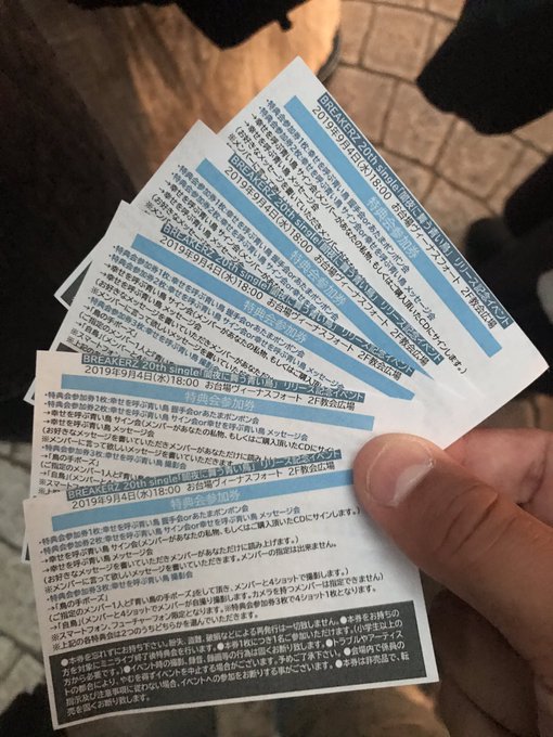 Release comment video clip of the guys have been uploaded via YouTube https://www.youtube.com/watch?v=h7DfzXLr_6I&t=0s I reuploaded the clip via my Twitter https://twitter.com/iamkarenpang/sta...89920285036545 Also later on today , to celebrate the official release of Yamino ni Mau Aoi Tori , a release event will be held at Tokyo's Odaiba Venus Fort 2nd Floor Kyoukai Hiroba at 6pm Japan time Order of Yamino ni Mau Aoi Tori from selective CD shops will include 1 event participation ticket and this apply to all 3 versions of the single If not , fans can just buy Yamino ni Mau Aoi Tori later on at Odaiba Venus Fort 2nd Floor Kyoukai Hiroba before the release event starts 5 different redemption items for 4th Sept release event The 5 items that can be redeemed during the 5 Tokuten Kai are : 1 event participation ticket - shake BREAKERZ's hands OR - BREAKERZ will pat your head (?!?!?!) 2 event participation tickets - get BREAKERZ's autograph The guys will autograph fans' personal belongings & name written on each item is limited to 8 characters (Katakana , Hiragana & Romanji are only accepted) OR - Request BREAKERZ to say something Limited to 10 characters , maximum of 30 characters If message content is inappropriate , Being staff has the right to reject 3 event participation tickets - take a 4 shot photo with BREAKERZ In this situation , Being staff will use fans' IT gadgets for the photo taking and that includes handphones + tablets In rare circumstances if Being staff had problems handling the fans' IT gadgets during the photo taking , fans will be allowed to retake the photo with the guys for the 2nd time without any penalty involved http://breakerz-web.net/news/release_043-6.html Omg , ahahahaha I can't believe the guys brought back the head petting Tokuten aspect back o_O xD I thought the head petting Tokuten aspect as part of last year's D×D×D/GREAT AMBITIOUS -Single Version- would be a 1 off thing but guess not , ROFL The head petting & BREAKERZ message request are 2 new Tokuten that're offer today & also the subsequent reminding Yamino ni Mau Aoi Tori release events |