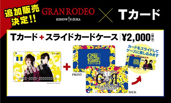 Lantis has decided to sell the special TSUTAYA card with GRANRODEO design & card case tomorrow at Zepp DiverCity https://pbs.twimg.com/media/ECkGYTsV...jpg&name=small Both items originally only can be purchased online via TSUTAYA but not anymore Each fan only can purchased a maximum of 5 items https://twitter.com/GR_staff/status/1164468998391549952 |