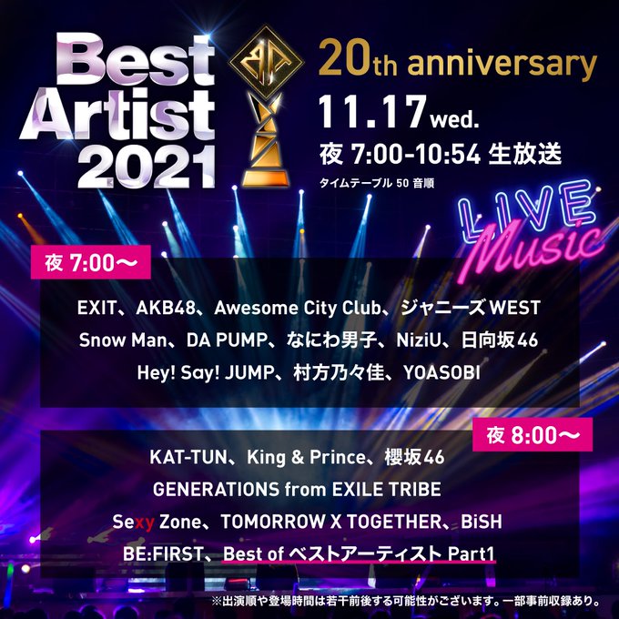 Show will be aired live on 17th Nov 日本テレビ系「日テレ系音楽の祭典『ベストアーティスト2021』」 2021年11月17日(水)19:00~22:54 <出演者> EXIT / AKB48 / KAT-TUN / 関ジャニ∞ / King & Prince / 櫻坂46 / ジャニーズWEST / SixTONES / Snow Man / Sexy Zone / なにわ男子 / NiziU / NEWS / 乃木坂46 / Perfume / 日向坂46 / Hey! Say! JUMP / MISIA / YOASOBI / LiSA / and more https://natalie.mu/music/news/452478 |
