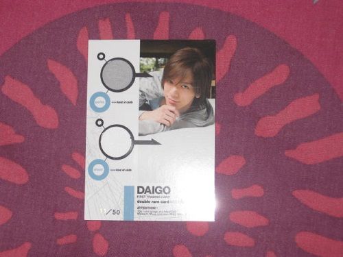 http://img.photobucket.com/albums/v2...I/IMG_6186.jpg 2 DAIGO trading cards in Itsumo Dakishimete & DAIGO☆STARDUST's Daisy mode :D All 3 trading cards of DAIGO's Itsumo Dakishimete / Mugen∞REBIRTH , all mine mine mine ♥♥♥ http://img.photobucket.com/albums/v2...I/IMG_6188.jpg DAIGO☆STARDUST feels so odd here haha And my fave part , DAIGO way back in 2009/2010 <3 http://img.photobucket.com/albums/v2...I/IMG_6190.jpg double rare costume trading card from 2010's DAIGO FIRST TRADING CARD collection (front) http://img.photobucket.com/albums/v2...I/IMG_6192.jpg double rare costume trading card from 2010's DAIGO FIRST TRADING CARD collection (back) http://img.photobucket.com/albums/v2...I/IMG_6193.jpg 8 DAIGO SPECIAL MOMENTS IN THIS CARD photocards (front) http://img.photobucket.com/albums/v2...I/IMG_6194.jpg 8 DAIGO SPECIAL MOMENTS IN THIS CARD photocards (back) 2009/2010 DAIGO still looked awesome , especially when he went to L.A in 2009 to shoot his very 1st photobook + 1st trading card collection back to back each other , ah what great memories :heart Never would have thought these are still sold online up to now as these cards are not easy to get hold of anymore but of course me being me , I do all of these things best ;D |