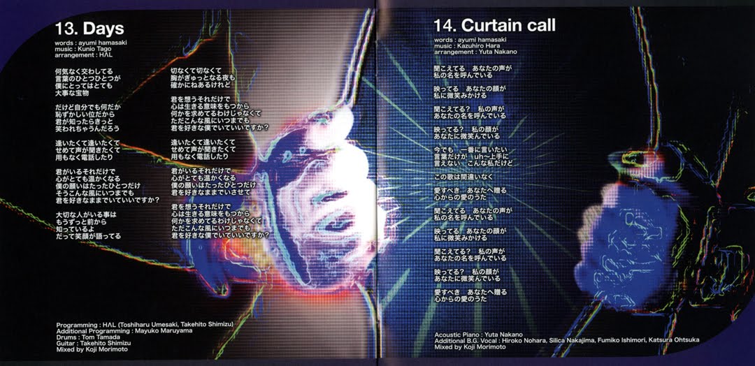 @Andrenekoi - never noticed the gradation of the tv's colours! I always loved the rollin' - GREEN (the transition point) - Load of the SHUGYO part because it covers the two main parts of the album (electropop/8bit from track 1-6 and rock section from 8-12). In the first section (electronica section), ayu tries to say that we should take action to obtain what we want (in NEXT LEVEL - "When we feel the breeze Let's squeeze each other's hands/ We don't need/ A lot of words", in EnergizE - "It doesn't matter if there's no guarantee that it'll be okay /Just nod and agree /Cause that's our courage", in Sparkle - "If you just look, nothing'll ever happen /You'll never get it /Are you just gonne stand there /Biting your nails forever?". The light musical choice (electropop, 8bit) fits perfectly the note of optimism of starting something new. GREEN marks the transition point, the doubt, the insecurity of starting a new way - "Why is it so difficult /For people to follow their hearts? ". The traditional vibe of the song - a quiet, meditative place in which we start thinking if it's good to take a new path or not. The second section of the album (the rock section) is the place in which we are determined to take action and this is exactly what we are going to do. It's natural that every courage comes with fear but it's time for a change - in Identity - "I persistently and earnestly face things head on / That's my ID ID (oh) ID ID (oh oh oh)/ I don't handily agree to everything / That's my ID ID (oh) ID ID (oh oh oh) / It's not important how I want people to think of me / What I want is to protect how I want to be ", in Rule - "We don't need rules / That someone else made up / 'Cause we are the rules / And we won't stand down ", in LOVE 'n' HATE - "And I don't want (you) to hate me / So I decided to leave". The final section (the ballads) is made by tracks 13 & 14. The conclusion of the whole idea with a bit of nostalgy in Days for the old good days - "I miss you, I miss you / So I call you for no reason / Just to hear your voice" and with ayu thanking the fans in Curtain Call for supporting her in this long, long journey - "To you, my beloved / I send a love song from my heart". |