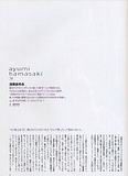 I love ayu's style here. (●´∀`)ノ♡ Do visit dearestayu for larger scans. ![]() ----- ![]() ![]() ----- ![]() ![]() Symbolic new song "M" featuring Virgin Mary has been released. A majestic poem, coupled with a voice directly conveying her feelings. Here is the song that "cannot exist if not for Hamasaki Ayumi". So just what does ayu herself feel about her passionate and exciting year of 2000? 2000 has been an exciting year for Hamasaki Ayumi. A trilogy work born from "despair", her first nationwide tour, done in an experimental style with 2 separate Chapters, and her 3rd album "Duty", which she calls her "societal piece". Furthermore, she released her last new song for the millenium, "M", at amazing speed. All these has set a definite pace for her work's direction in 2001. With that, for this year's last issue of GiRLPOP, we present to you "The Inside Story of Hamasaki Ayumi's 2000". ---When you released the trilogy, you spoke about despair, arising from the gap between the things you wished to convey and how the world perceives those things. What is your reflection on that, at this point in time? "If I were to give "vogue" and "Far away" even just a casual listen now, I'll still feel lots of emotion. More than singing, it felt like I was squeezing with all my might and collecting all the drops of emotion bit by bit. However, looking back now, I did enjoy myself. Locking myself alone in a hotel room, listening earnestly to the music, and for some reason, close friends would come to visit me every night." ---Even as you rejected others, you must have been comfortable in a world of your own. So how did you overcome the sense of despair in the end? "In the end, I didn't overcome it. I felt it was better that I didn't. Up until then, whenever I'm with people of an older generation, or those who have been working behind-the-scenes, I feel as if I'm just a follower. And I somehow feel like the church's teachings were somehow making fun of me. In other words, being in such positions always made me ashamed of myself. However, I've come to think that it's alright to leave the gap open. "Things may seem that way, but that's not the truth"." ----- ![]() ![]() ---So what's important is not whether something can be seen, but if it really exists. You started preparing for your first tour with such a mindset. Initially, your plan was to release the new album between Chapters 1 and 2 of the tour, right? "I was impatient. (laugh) For lots of things, I've always been claiming that I can't make it happen, but then I'll always somehow manage to achieve it in the end, so I had the feeling that things would turn out alright this time too. However, once I started preparing for Chapter 1, I realized that it really was impossible to release the new album then. And since I've already announced that I'll be doing 2 chapters for the tour, I was truly troubled by how I was going to do Chapter 2, and how I was going to change it and give it a different meaning from Chapter 1." ---But after the troubles, you managed to come up with a unique tour concept afterall. Does it feel magical, seeing the things you've imagined come true to that extent? "I didn't really think about it when I was doing it then, but when I was editing the videos, wow! I was really shocked. (laugh) Everything is just as I've imagined, and I realized that the staff had helped to refine the sets and movements without ayu even realizing it. And though I felt happy, I also felt a little burnt out. To have accomplished so much, I was uncertain about what I can do next." ---The show was changed a little for each different concert, right? "I had staff taking videos of every concert for record purposes. For this tour, we gave 2 shows at each venue, so Day 1's recording was of ayu, and Day 2's was of the dancers. After the 2 days, all the staff would gather and review the videos, then move on to the next venue. We kept that up all through the tour." ---It must have been tough, but it sounded like fun. Any moment when you felt a true sense of accomplishment? "Hmm, it was probably when the dancers were doing costume fittings during rehearsals at the gym in Idabashi. The costume designs were thought up by ayu, and the seamstress had put on a costume and was dancing in it. Some stylists were there too, and they were asking, "So, shall we settle for this?" As I watched from the audience seats, I just felt like crying. A costume that I thought would never make it was finally completed, and I was glad that the dancers really got to wear it." ---So you thought up all of the costumes. By the way, are you good at drawing? "I'm really horrible at it. (laugh) So it's really hard to get my ideas across." ---Making even a single costume takes a large amount of energy. And the album "Duty" was born from the tour. In a previous interview, you said that this album held a sense of duty for you. "I meant for the title "Duty" to convey the idea of "this is what I should do now", but I feel that it has changed a little. At that time, the tour was going full-force, and I really came into contact with lots of people, even though ayu seldom has the chance to really get involved with people normally. (laugh) But she was meeting with tens of thousands of audience everyday, and it was obvious that she would be influenced by that." ---Has there been any specific responses to your calling the album a "societal piece"? "My CEO called me one time to ask, "There's a company that wishes to use the lyrics from "Duty" album to educate their employees. Are you alright with that?". The employees of that company also commented that "these lyrics are like textbook material". Yep, that made me glad. Grown men are reading my lyrics, and though I'm not sure if they feel the same way as I do, I feel that I have gotten through to them." ---That's one proof that your idea of "society" has gotten through. Together with the album sales, Hamasaki Ayumi is now one of the winners. How are you goin