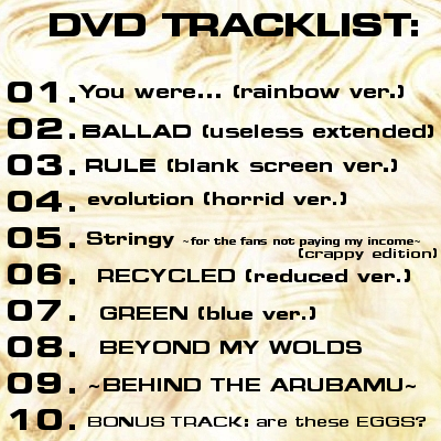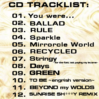 1. Intro 2. Song 3. Ballad 4. Interlude 5. dot dot dash dash dash dash dot (sung entirely in swahili sign language) 6. Typical ayu song #3 7. Guilty "for yet another typical ayu song" 8. DIAF Shimomura Kazuyoshi 9. Memorial Address (damn it, where do I live again?) 10. LOVE 'N' HATE "Bi-Polar Total super ***** PMS ayu Version" 11. Interlude Again 12. Rock Song 13. Because of You (This is not a kelly clarkson or neyo cover) 14. Bold & Delicious - C=3 remix - 15. Gonorrheal *cough* I mean...Canary-uh 16. Red Line ~obviously no one else spends money on my stuff~ 17. Typical closing sad ballad about lost love song 18. Hidden Track: Butt Sexodus '04 *Not an Utada Cover* 19. Hidden Hidden Track: I am...........um ![]() ![]() ![]()