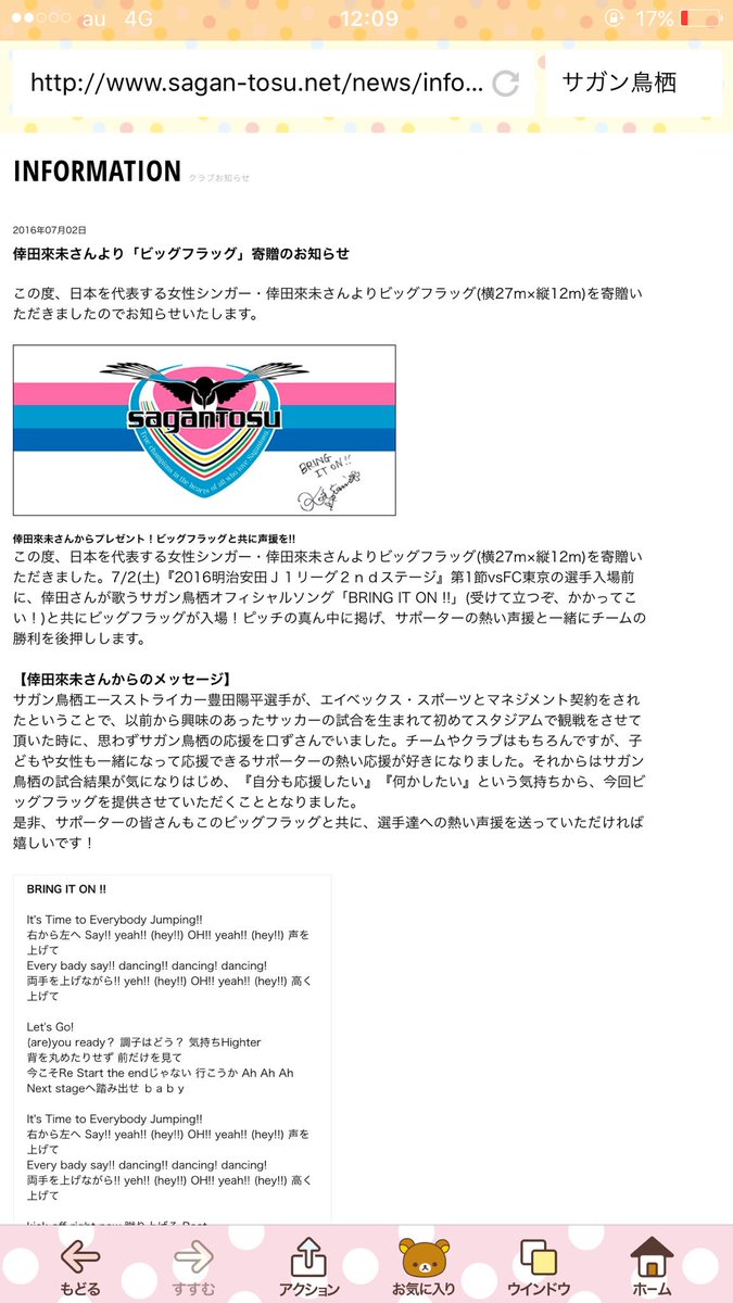 倖田來未さんが歌う「BRING IT ON !!」(受けて立つぞ、かかってこい!)と共にビッグフラッグが入場!サポーターの熱い声援と一緒にチーム の勝利を後押し! https://twitter.com/saganofficial17/...80609809965056 And here it is a little message from Kumi about the song: https://twitter.com/0056Momoka/statu...64142208667649 ---- EDIT This seems to be a gift from Kumi to the team, it's a big flag with her signature saying "BRING IT ON!!" The full message is here, and also the lyric of the song with the modifications: Spoiler: