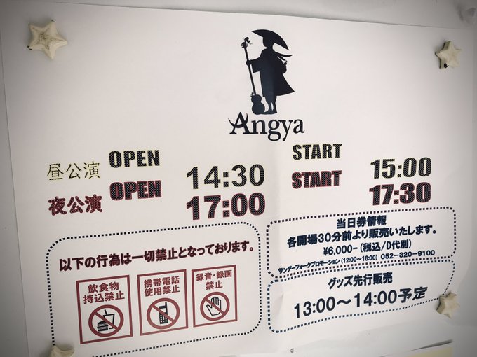 Today is a public holiday in Japan ie. Taiiku no Hi For today 1st session -- Doors open 14:30 / Concert starts 15:00 2nd session -- Doors open 17:00 / Concert starts 17:30 http://akihide.com/special/angya/ https://www.bottomline.co.jp/place/blcafe/ https://twitter.com/AKIHIDE_RAINMAN/...13442292641793 https://twitter.com/bottomline1989/s...30394876686339