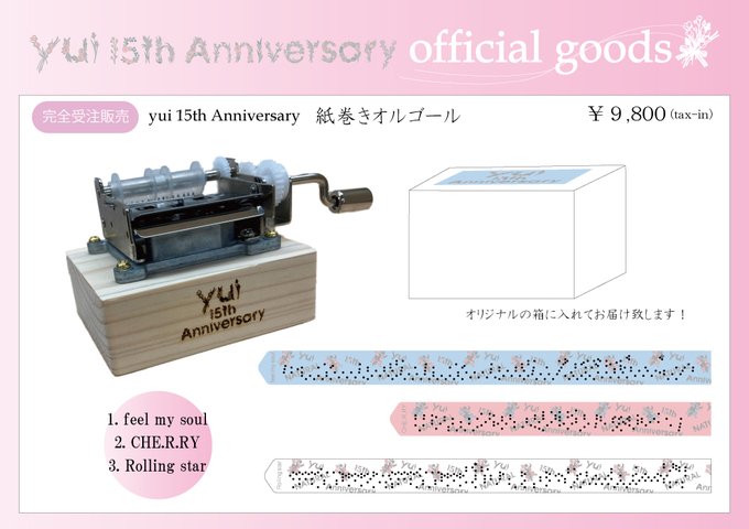 1) yui 15th Anniversary music box From tonight until 7th April Each music box is custom made to order & the music box include 3 choices of YUI's songs ie. feel my soul , CHE.R.RY & Rolling star 2) FLOWER FLOWER Lucky bag 2021 25,000 Yen worth of existing FLOWER FLOWER goods will be included in the lucky bag & now everything will be sold for 10,000 Yen https://www.sonymusic.co.jp/artist/F...ER/info/528142 https://twitter.com/FFLOWER_STAFF/st...40578703613953