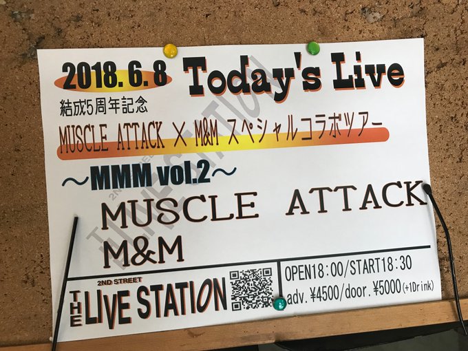MUSCLE ATTACK × M&M special collaboration tour ~MMM vol.2~ is their 2nd joint tour after 2016's MUSCLE ATTACK × M&M special collaboration tour ~MMM~ and the latest collaboration tour is to celebrate both bands' 5th anniversaries For today 8/6 (Fri) @ Tokyo's Meguro THE LIVE STATION OPEN 18:00 / START 18:30 http://shinpei-muscleattack.net/live/live_032.html