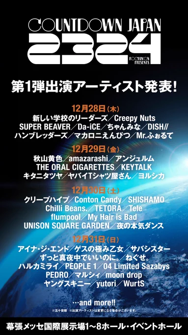 COUNTDOWN JAPAN 23/24 will take place on the last 4 days of the year at Chiba's Makuhari Messe
