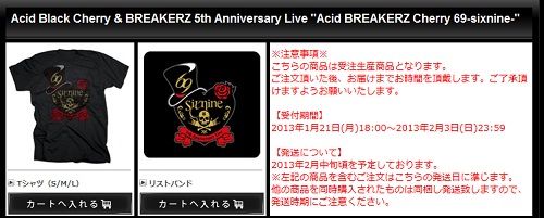 ![]() Leftover Acid Black Cherry & BREAKERZ 5th Anniversary Live "Acid BREAKERZ Cherry 69 -sixnine-" concert goods can be purchased via Musing now . http://musing.jp/shop/breakerz_goods/ Both the T-shirt & wristband can be purchased via Musing for a limited time period starting from today (21st Jan) ; 6pm Japan time - 3rd Feb (Sun) ; 11.59pm Japan time . 【受付期間】 2013年1月21日(月)18:00~2013年2月3日(日)23:59 Goods will be shipped to buyers from mid Feb onwards . 【発送について】 2013年2月中旬頃を予定しております。 ※左記の商品を含むご注文はこちらの発送日に準じます。 他の商品を同時購入されたものは同梱し発送致しますので、発送時期にご注意ください。