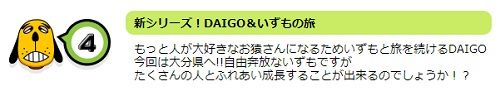 ![]() 14th December of episode of Tensai ! Shimura Dobusten will broadcast the brand new DAIGO x Izumo corner : ![]() 新シリーズ!DAIGO&いずもの旅 もっと人が大好きなお猿さんになるためいずもと旅を続けるDAIGO 今回は大分県へ!!自由奔放ないずもですが たくさんの人とふれあい成長することが出来るのでしょうか!?