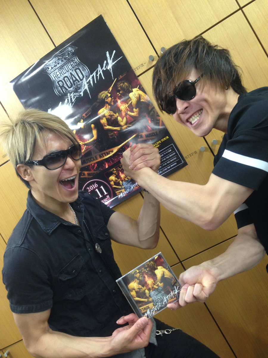 卒業生でBREAKERZのSHINPEIさんがソロプロジェクト『マッスルアタック』の新譜を持って来校 してくれました。同バンドで同じく卒業生HIDEHIROさんとジャケットの再現(笑)