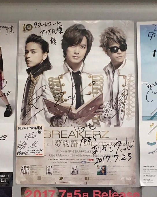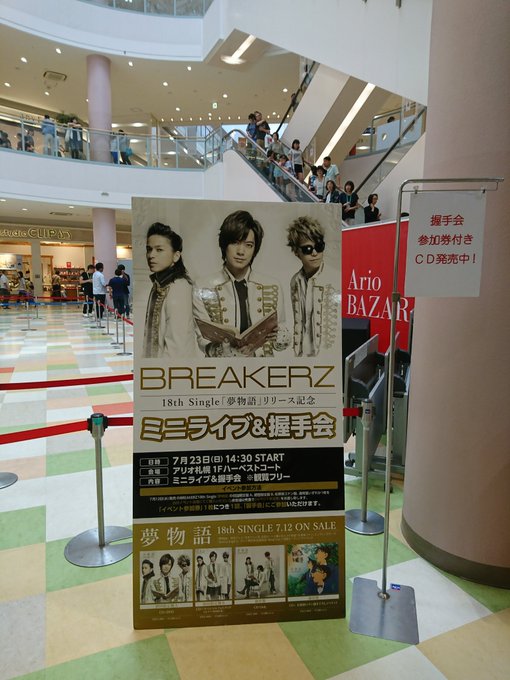 For today Prefecture / Venue : 1st floor Ario Sapporo 1F Harvest Court Time : 2.30pm http://www.ario-sapporo.jp/event/759...09a68bb95.html https://breakerz-web.net/info_re_066.html DAIGO & SHINPEI have already tweeted about it DAIGO 今日は北海道、札幌にいます! リリースイベント!アリオ! 14:30から! 会場:1階 アリオ札幌1Fハーベストコート 住所:札幌市東区北7条東9丁目2番20 https://t.co/JHpbTnee8v お近くの方も是非逢いにきてね!!!(///ω///)♪ https://twitter.com/Daigo19780408/st...58538365583362 SHINPEI おはよう! 今日は久しぶりの札幌で、BREAKERZリリースイベントです。 デビュー以来ずっとお世話になっている北海道、嬉しいな★ 是非会いましょう! 7/23(日)14:30~ 会場:アリオ札幌1Fハーベストコート https://t.co/jztuOqadz4 https://twitter.com/shinpei_brz/stat...82983314247681