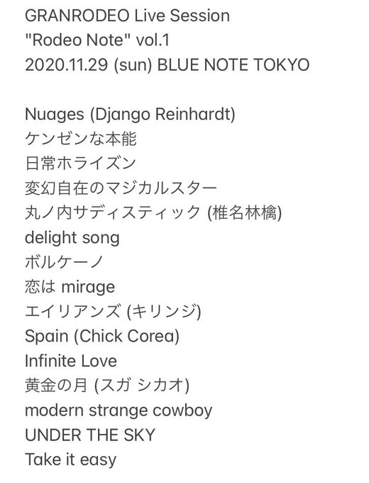 Setlist 1) Nuages (Django Reinhardt) 2) Kenzen na Honnou 3) Nichijou Horizon 4) Hengenjizai no Magical Star 5) Marunouchi Sadistic (Sheena Ringo) 6) delight song 7) Volcano 8) Koi wa mirage 9) Aliens (Kirinji) 10) Spain (Chick Corea) 11) Infinite Love 12) Ougonno Tsuki (Suga Shikao) 13) modern strange cowboy 14) UNDER THE SKY 15) Take it easy More photos https://www.barks.jp/news/?id=1000193132 https://natalie.mu/music/news/406989 Wow at Volcano in the setlist <3