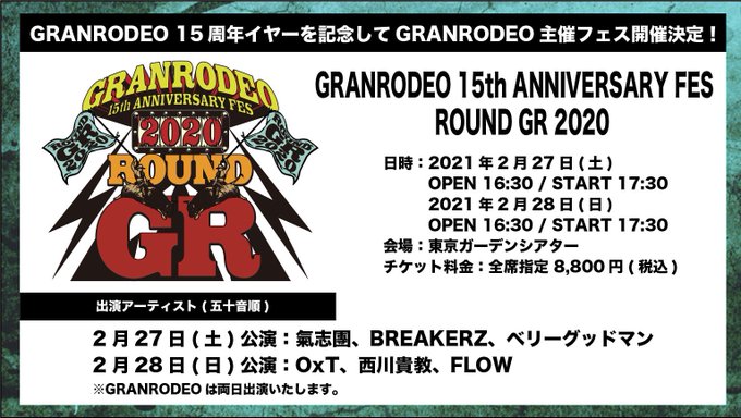 2/27 - Kishidan , BREAKERZ & <b>BERRY GOODMAN</b> 2/28 - OxT, Nishikawa Takanori & <b>FLOW</b> https://twitter.com/GR_staff/status/1340855553250095105 No surprises seeing FLOW's name I'm sure if not for COVID-19 more artistes would have perform with GRANRODEO :s